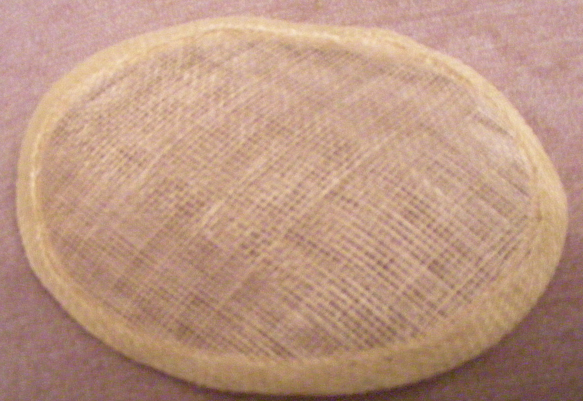 ...with one fascinator, anyway, the cream one. I marked the shape I wanted to achieve, using an oval box which I use to keep my millinery pins in, while it was still on the dolly, and then removed it. On the table, it looks pretty unprepossessing, but you can see the distinct curve that has been produced by drying the flat fabric on the dolly.
